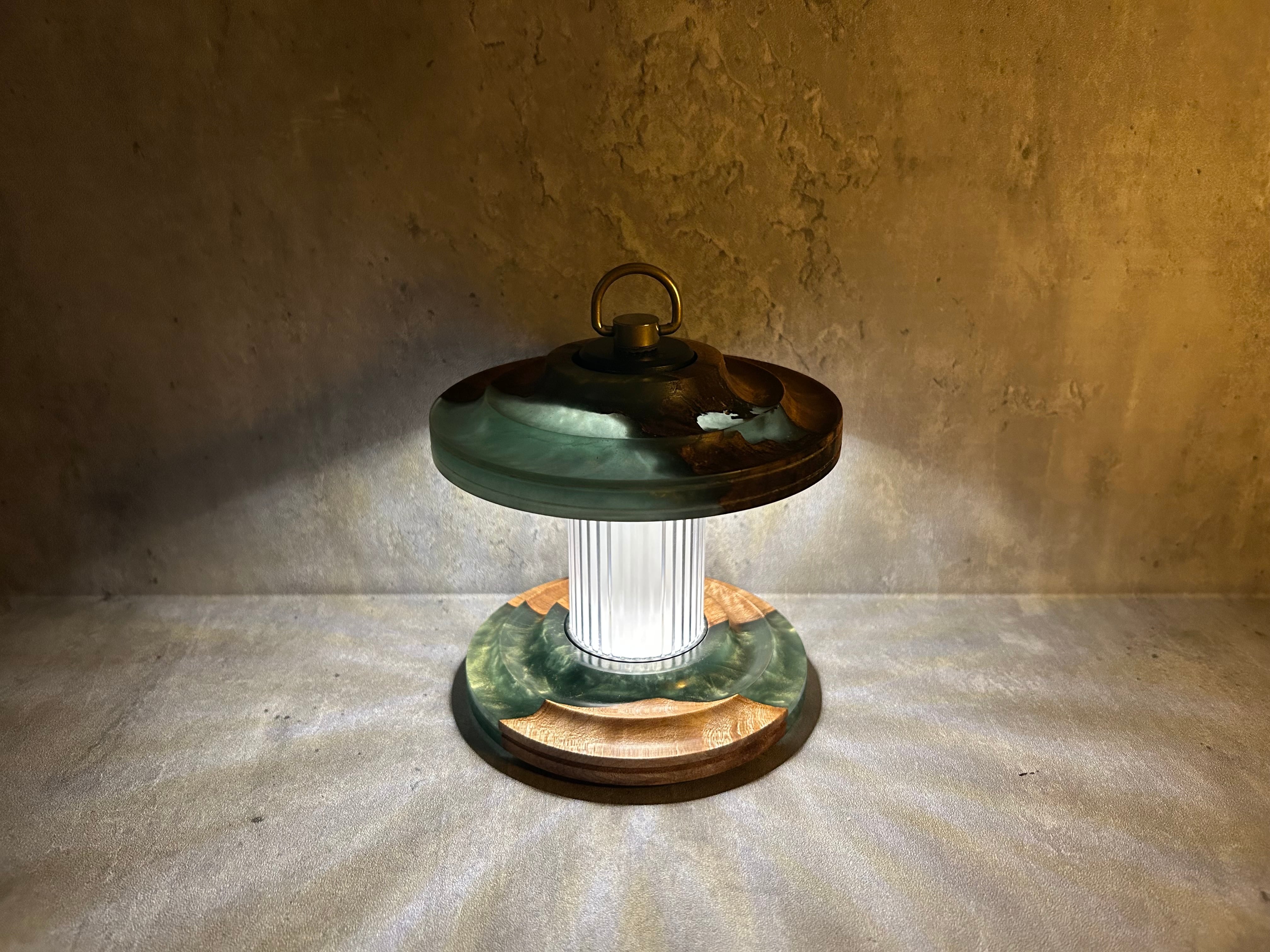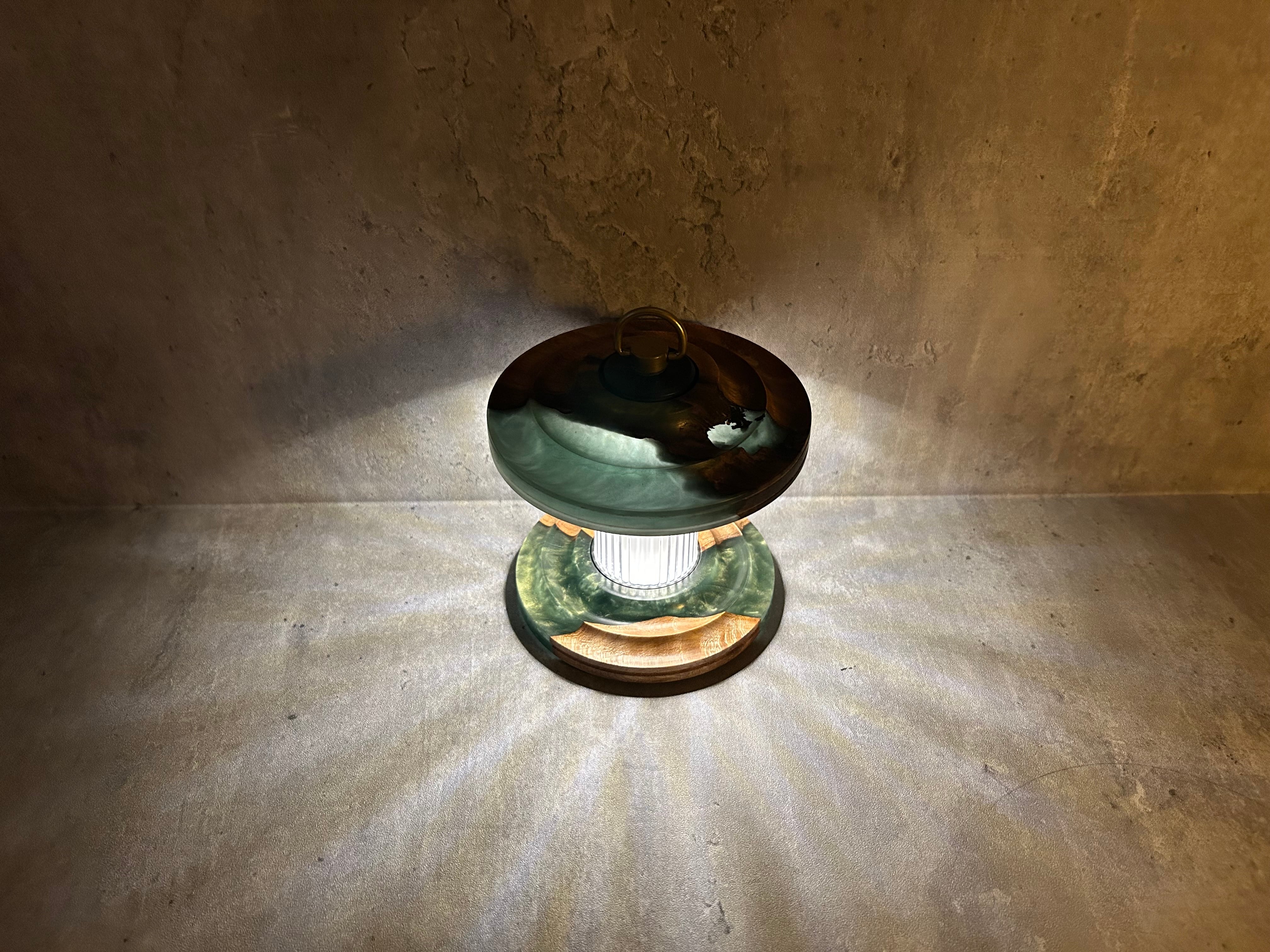 オニグルミ(ジャパニーズウォールナット)とレジンを組み合わせて制作した、38灯専用ランプシェードと台座のセットです。