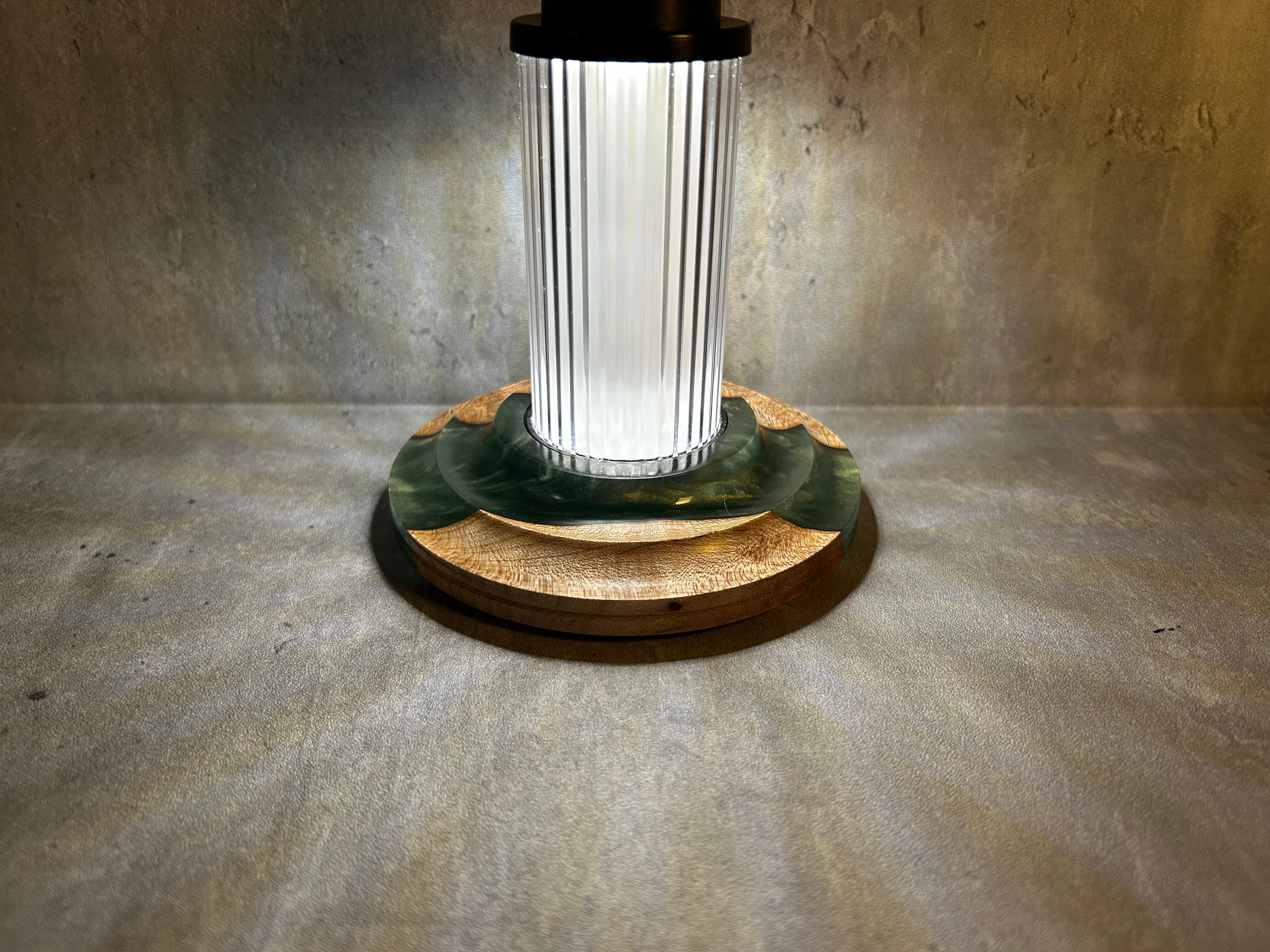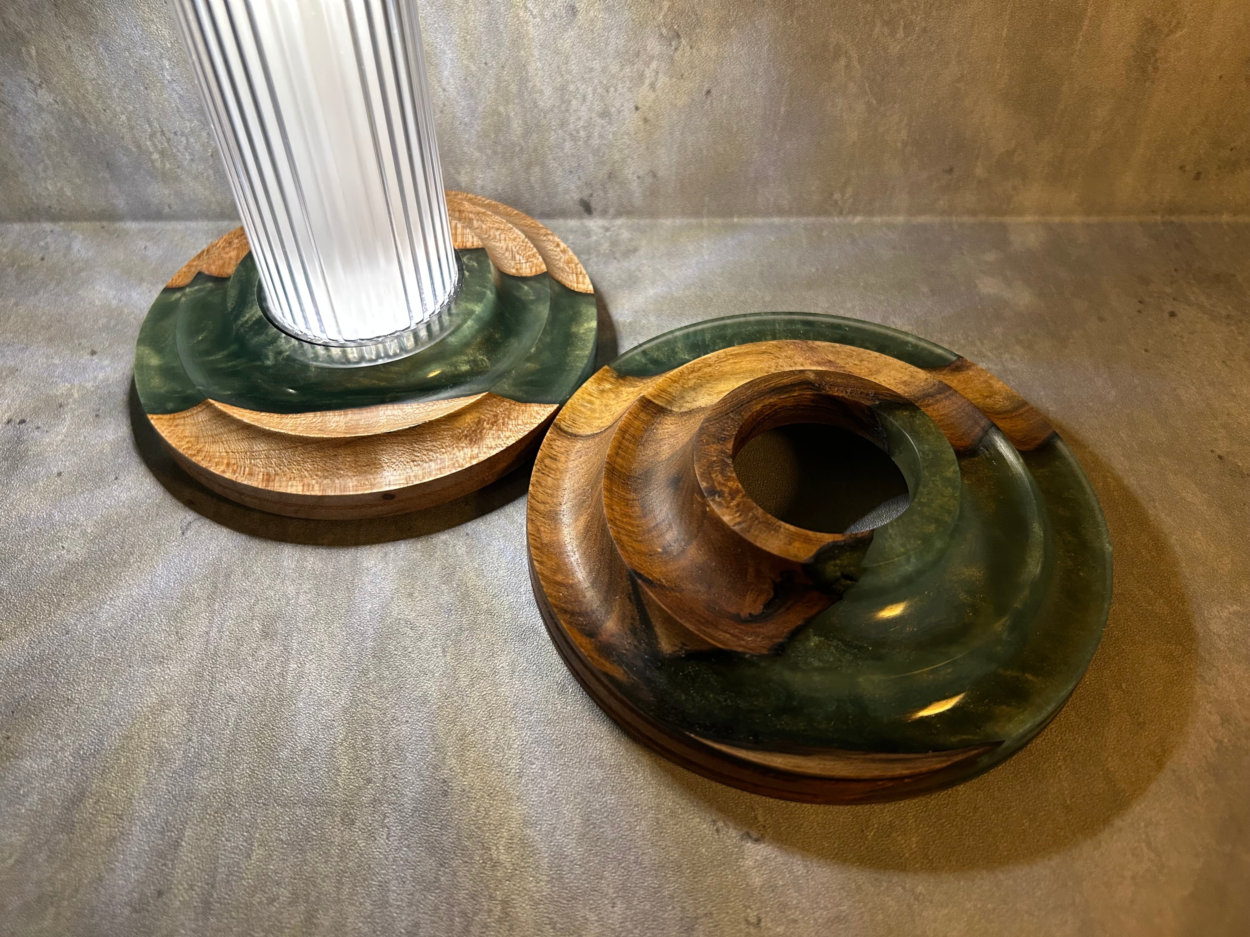 オニグルミ(ジャパニーズウォールナット)とレジンを組み合わせて制作した、38灯専用ランプシェードと台座のセットです。