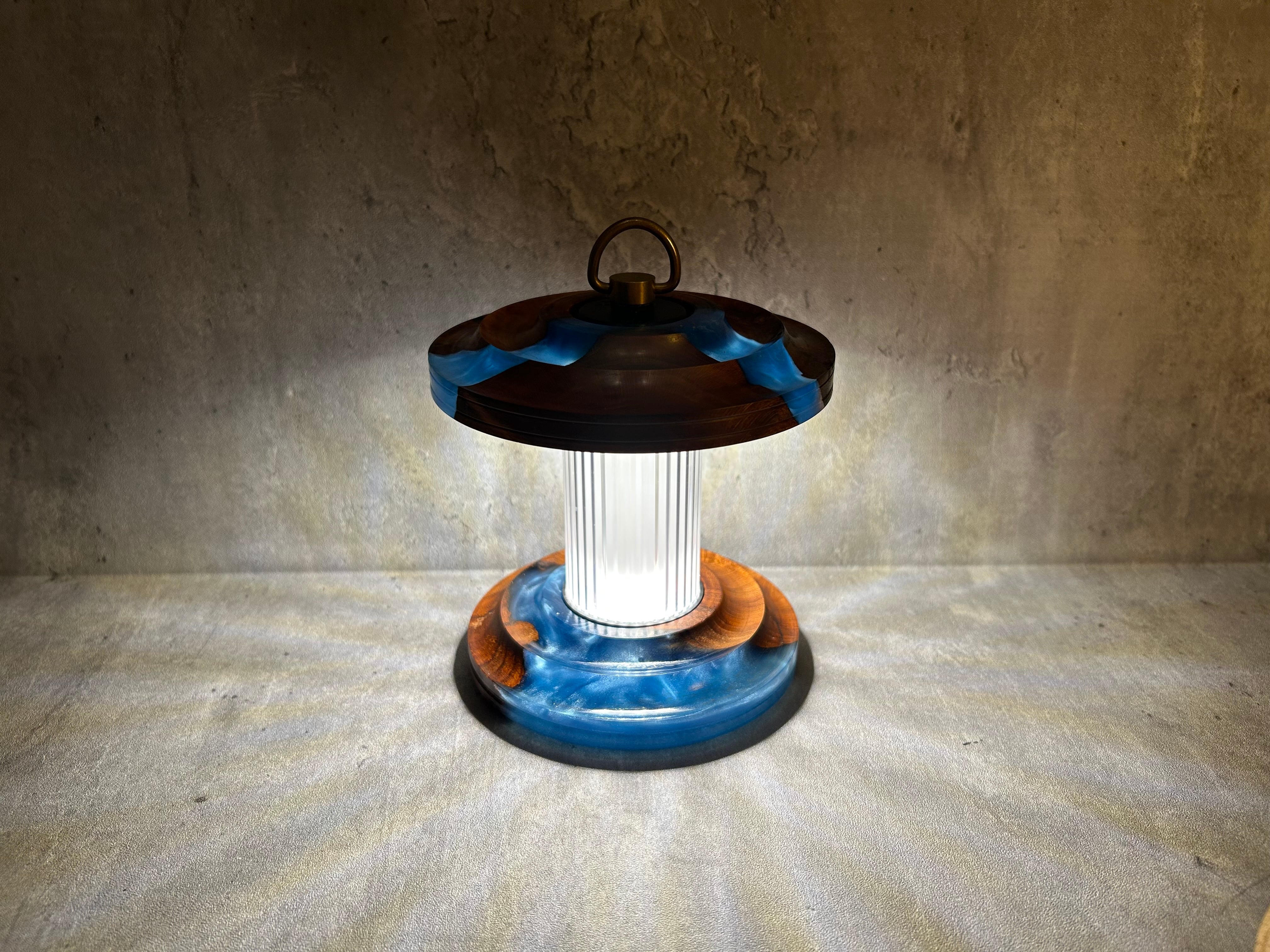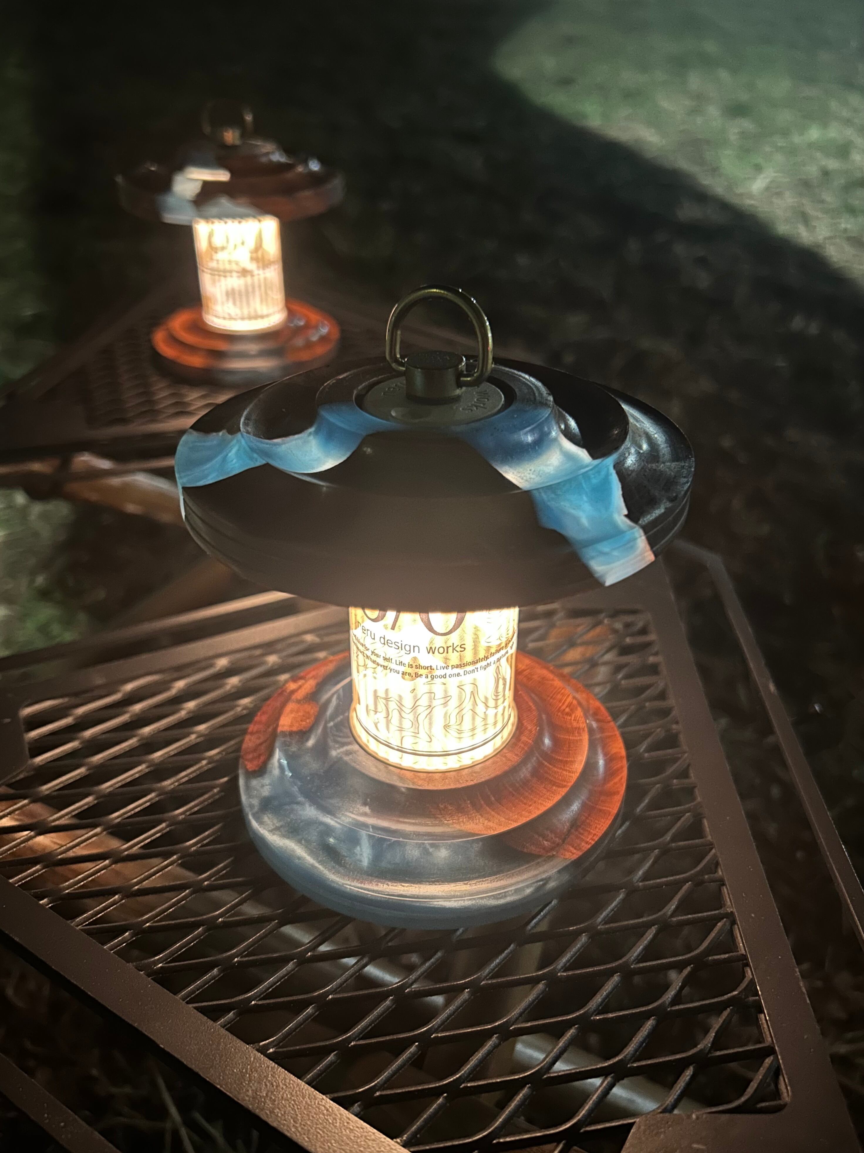 灯りをともすと、レジンの奥行きと木の質感が柔らかく浮かび上がり